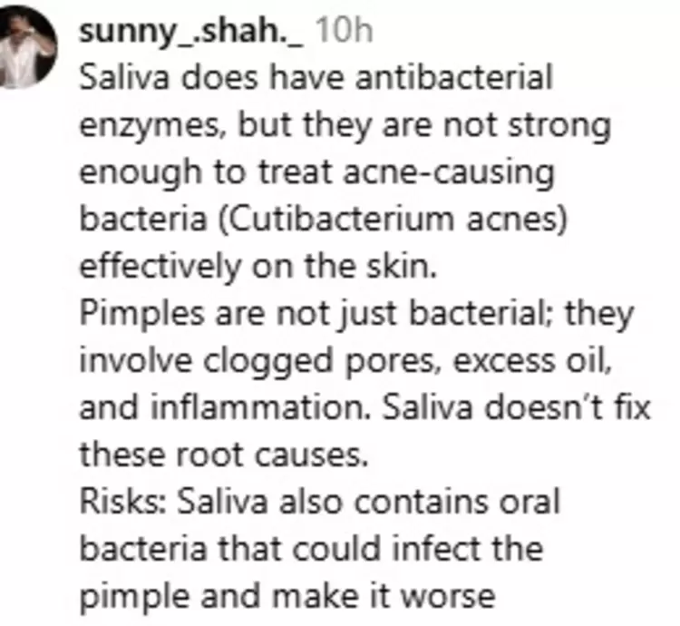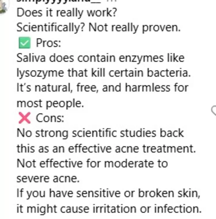 He said, “Does it really work? Scientifically? Not really proven.✅ Pros: Saliva does contain enzymes like lysozyme that kill certain bacteria. It’s natural, free, and harmless for most people.❌ Cons: No strong scientific studies back this as an effective acne treatment. Not effective for moderate to severe acne. If you have sensitive or broken skin, it might cause irritation or infection.”